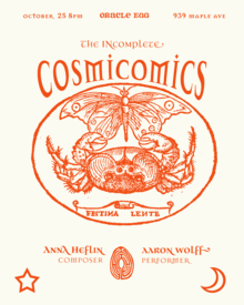 The INcomplete Cosmicomics is a stand-alone opera by composer/writer Anna Heflin for vocalizing cellist/actor and electronics in which author Italo Calvino's mystical entity Qfwfq continues his journey. After being stuck in a void for thousands of years with only a cello and a looper, the incongruous and multifaceted Qfwfq comes to life. Upon exiting the void, he faces a choice: he can either explode into existence as all beings or end linear time. Inspired by Calvino's The Complete Cosmicomics, Heflin's work is an original creation in which Qfwfq takes the reins of his own narrative. Equipped with a sharp sense of humor and sensuality, Qfwfq ruminates, charms and hypnotizes in his quest to break the loops of life. The work showcases Juilliard-educated cellist Aaron Wolff as Qfwfq, whose acting credits include Danny Gopnik in the Coen brothers A Serious Man.