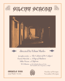 Silent Scream is a simultaneous screening of four silent horror films from the 1920s, live-scored by an ensemble of soloists. The films are projected onto different hanging surfaces, dividing the space and housing the performers. Each musician is tasked with providing the score for one of the films without responding to any of the other musicians. The audience is invited to wander the space, mixing the audio and video for themselves, choosing or changing their vantage point as they see fit. Part performance, part installation, part haunted house, Silent Scream tests the flexibility of the relationship between sound, screen, and viewer by experimenting with how material can inform a musicians improvisation and the different ways a sense of ensemble can be created (or destroyed).