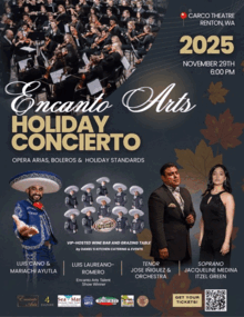 We are thrilled to invite you to the 2025 Encanto Arts Holiday Concierto at the Carco Theatre in Renton on Saturday, November 29th, 2025. The concert will begin at 6:00 pm, followed by a festive cocktail and hors doeuvres reception at 8:00 pm for sponsors / VIP ticket holders. Proceeds from this event will support the mission of Encanto Arts.