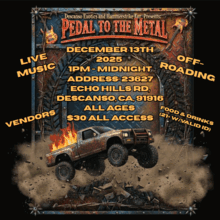 December 13th, 1PM til Midnight, Address: 23627 Echo Hills Rd, Descanso, CA, 91916 DESCANSO EXOTICS AND HAMMERSTRIKE ENTERTAINMENT PRESENT: PEDAL TO THE METAL! Prepare yourselves for an entire day of nonstop off-roading and metal music. Event starts at 1 PM with music, vendors and off-roading trucks all in one place. All ages welcome, $30 gets you access to the music areas along with the vendor village and sideline views of the jumps our off-roading team will be navigating. Come one come all, parking will be limited onsite, once that is filled up street parking will be available. ALL SALES ARE FINAL, email seharris619@gmail.com for questions or vendor opportunities.