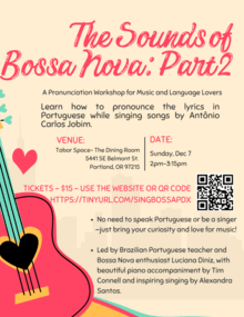 No need to speak Portuguese or be a singer just bring your curiosity and love for music! Led by Brazilian Portuguese teacher and Bossa Nova enthusiast Luciana Diniz, with beautiful piano accompaniment by Tim Connell and inspiring singing by Alexandra Santos.