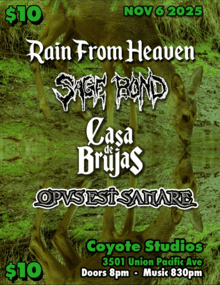 Set times: Casa De Bruja 830 Sage Bond 9ish Cellist 930ish Rain From Heaven 10ish