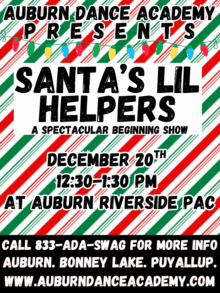 Auburn Dance Academy is pleased to announce our 2nd annual Beginning program recital of "Santa's Little Helpers". The Beginning students have learned fun holiday dances and are sure to WOW the audience of ALL ages. You never know what will happen with our tiniest of dancers. These cuties will bring a smile to your face and the music will get you in the Christmas spirit. This show is under the direction of Jennifer Carrington and Co-Directors Chris Carrington and Karley Kearney