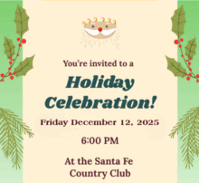 Come join us for our annual GOP Christmas Party at the Santa Fe Country Club on December 12th at 6pm This site is to order your dinner. All extras included in your price, including dessert, beverage, tip and tax.. We will have great food, entertainment and a very special pinata for everyone to enjoy.