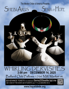 On Sunday, December 14, 2025, at 3:00 pm, the Whirling Dervishes of the Mevlevi Order of America will present the Sema Ceremony honoring the great Sufi Mystical Poet, Hz. Mevlana Jelaluddin Rumi, at Ballard Odd Fellows Temple. The event features the prayer dancing of the Whirling Dervishes, a ceremony presented as it has been for over 800 years. In their traditional felt hats and flowing white garments, turners whirl in unison, attuning to the music of the heart. The MOA Mutrip will play classical and devotional Turkish music, including musicians of the Society for Turkish Classical Music .