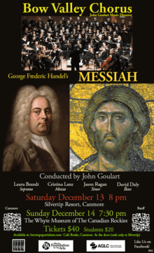 The 50-member Bow Valley Chorus is thrilled to continue its Christmas tradition of performing Messiah, George Frideric Handels choral masterpiece. This awe-inspiring music was composed in 1741 and to this day remains one of the worlds most popular musical works. Bow Valley Chorus, under the inspirational, passionate and award-winning direction of John Goulart, will be accompanied by orchestra, with soloists Laura Brandt (Soprano), Cristina Lanz (Mezzo), Jason Ragan (Tenor) and David Daly (Bass). Treat your friends, family and yourself to the gift of music this Christmas season. Join Bow Valley Chorus for their uplifting and glorious Messiah at the Sivertip Resort in Canmore