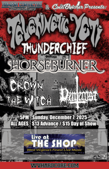 They are joined by Thunderchief. Thunderchief is an American sludge and doom metal duo from Richmond, Virginia, formed in 2006 by Rik Surly and Erik Larson. They are known for their "sludge 'n' roll" sound, with albums like The Tone If Sorrow (2015), No Sufferance for Thy Fools (2020), and Synanthrope (2021). The band is characterized by a heavy, riff-driven style influenced by bands like Black Sabbath and Sleep. And by the Stoner, Doom, Sludge metal quartet, Horseburner, from Parkersburg, WV.