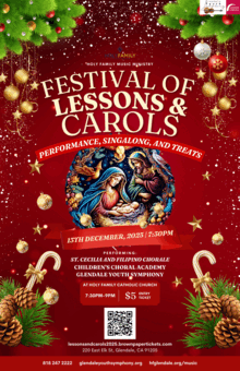 The music ministry of Holy Family presents an evening of Christmas carols, Holiday music, treats, and a singalong. The ministry includes the St. Cecilia Chorale, Filipino Chorale, Children's Choral Academy, and our resident orchestra, the Glendale Youth Symphony.
