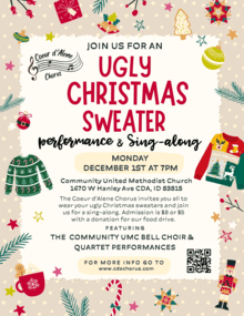 FEATURING THE COMMUNITY UMC BELL CHOIR & SPECIAL QUARTETS! The Coeur d'Alene Chorus invites you to wear your ugly Christmas sweaters and join us for a sing-along!