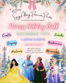 SING ALONG PRINCESS PARTIES HOLIDAY BALL! December 14th 1-3pm Join us for an afternoon filled with magic, crafts, singing, makeovers, delicious snacks, photo opportunities, and time spent with your favorite princesses! A special guest will be stopping by as well.