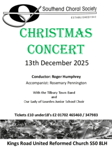 Southend Choral Society presents its annual Christmas concert of traditional and contemporary Christmas music, with contributions from The Tilbury Town Band and Our Lady of Lourdes Junior School Choir. Father Christmas will make a visit, and there will also be audience participation in Christmas songs and well-loved carols. Hot drinks and seasonal refreshments will also be available.