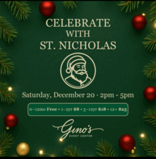 Join us for an afternoon of Holiday Cheer celebrating Gino's First Annual Food, Fun, and Carols with Saint Nick. Bring the whole family for a magical experience filled with music, creative crafts, festive foods, and drink. Your ticket includes entrance into our Holiday Raffle and take part in photo opts and chats with Saint Nick himself.