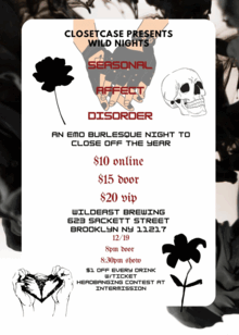 The winter blues may be hard, but we can headbang harder! Join us for our next installment of Wild Nights, where we'll be fighting the cold and spreading emo holiday sorrow. All tickets receive a drink discount, and VIP tickets get a picture with Adoration, priority seating, and a free raffle ticket!
