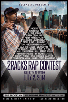 2Racks Rap Contest announces the return to Brooklyn on July 2, 2014. 2Racks is a Nation-Wide Original Song Contest started in 2010 by Sellassie and Inhouse Talent in San Francisco, CA. 2Racks Rap Contest stops in more than 12 cities from coast to coast including Los Angeles, New York, San Francisco, Berkeley, Chicago, DC, Atlanta, Austin, Houston, Orlando & Seattle. 2Racks looks forward to returning to the birthplace of Hip Hop.