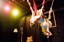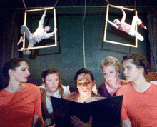 On giant lampshades, clotheslines, chains and picture frames, Aloft's new aerial show, "The Dinner of Our Discontent" veers from heartbreaking to hilarious at the drop of a plate. Directed by Shayna Swanson and choreographed by Swanson and the company,"Dinner" follows five estranged sisters as they return to the home they grew up in after their parents' sudden deaths. Their childhood emotions and resentments take center stage as they encounter the same issues that plagued them through out their childhoods: the twins still dress (and walk, and eat) alike, the second sister vies for the affection of the oldest, and they all walk heartlessly over the meek youngest sister. And then there's the grief stricken butler, having lived in the house longer than any of the girls, having raised them and waited on them every day with no thanks, now faced with having to leave the only family he ever knew. The parents watch the madness from two picture frames on the back wall, their eyes following the action, tormented by their sudden separation and longing for their family to be whole again.