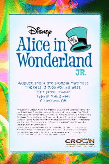 Disney's ALICE IN WONDERLAND JR. is a fast-paced stage adaptation of the timeless film, featuring updated dialogue and new arrangements of such classic Disney songs as "I'm Late," "The Un-birthday Song" and "Zip-A-Dee-Doo-Dah."