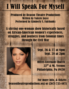 "I Will Speak for Myself" is a stirring one-woman play that blends historical interpretation with performance and breathes life into slave narratives, personal letters and memoirs, diary entries, court records, poems, public addresses, and newspaper advertisements creating real identities that share these African-American women's experiences, struggles, and journeys in their own voices from Colonial times through the Civil War. The play is written and directed by Valerie Joyce, Associate Professor of Theatre at Villanova University and features Barrymore-nominated actress Kimberly S. Fairbanks, who can be seen and heard in numerous voice-overs, commercials, and independent films. Fairbanks has a Master's in Theatre from Villanova and has performed with many regional theatres including Delaware Theater Company, InterAct Theatre Company, The Mint Theatre (off Broadway); NJ Repertory Company; and the Walnut Street Theatre.