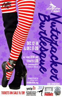 Tickets for this production of The Nutcracker Burlesque will go on sale at 12:01am, November 28. The entire run of the show is typically sold out in a few days, so planning to purchase tickets on "Black Friday" is encouraged. Sponsored by: St. Lawrence Arts Center, Drouin Dance Center, Yelp, The Portland Phoenix, and Gorham Self Storage.