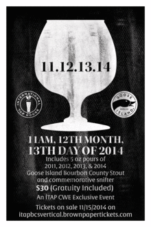 11am in the 12th month on the 13th day of the year 2014, a tapping of epic proportion will happen at iTap Central West End: 11.12.13.14 BCS. That's right, four years of Goose Island Bourbon County Stout will be poured for your enjoyment. This is a one time only opportunity to experience this vertical on draft, and you certainly don't want to miss it!
