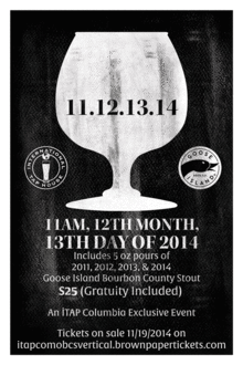 11am in the 12th month on the 13th day of the year 2014, a tapping of epic proportion will happen at iTap Columbia, MO: 11.12.13.14 BCS. That's right, four years of Goose Island Bourbon County Stout will be poured for your enjoyment. This is a one time only opportunity to experience this vertical on draft, and you certainly don't want to miss it!