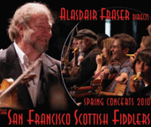 In a last minute development, Alasdair Fraser, who has returned to Scotland for a family emergency, has invited Seattle-based brother-sister duo Ryan and Cali McKasson to perform in his stead. Ryan and Cali began attending to Alasdair's Valley of the Moon Scottish Fiddle School while still in their teens, went on to become fine exponents of the Scottish tradition, and these days return to teach at the camp. Ryan, on fiddle, and Cali, on piano, have recorded and performed as the core of their band The McKassons since 2004. Ryan plays with the popular contra dance band, The Syncopaths, and will be performing with Ensemble Gallilei in upcoming multi-media show "Seeing American", produced in partnership with the Metropolitan Museum of Art and Neil Conan from NPR's Talk of the Nation. "We basically take a village on the road; we're living the music" says the group's music director, renowned Scottish fiddler Alasdair Fraser, who together with his wife Sally Ashcraft and about 40 friends founded San Francisco Scottish Fiddlers (SFSF) in 1987. There are now over 200 members, stretching from northern California, throughout the US and in several other countries, including Scotland, France, Canada and Australia. "Music crosses all kinds of boundaries, and clears away obstacles; children and adults, individuals with widely varying backgrounds and levels of musical skill, and people who don't even share a common spoken language can be part of the village in a meaningful way." That sense of participation crosses over into the audiences, as well. SFSF concerts tend to inspire spontaneous dancing in the aisles. The fiddlers on stage have learned the tunes by heart, and you won't see music stands on stage. People are listening to each other, and there's a real sense of play. "With Scottish traditional fiddle music, you can go from an elegant 18th century pastoral air to a get-wild, get-down dance tune in the stroke of a bow," says Fraser. "and there are a few hundred years of tunes to get through in a given concert!" SFSF members get together to share their love of the music during meet monthly informal meetings and numerous engagements around the Bay Area throughout the year and occasionally, they go on tour. In addition to the annual spring concert series, the group has toured in Alaska, and across northern California, including a performance at the Lake Tahoe Music Festival.